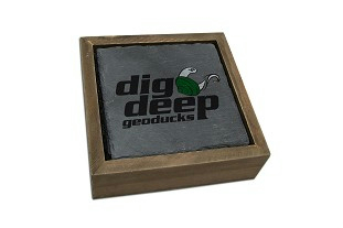 These genuine slate coasters make a classy addition to any bar or coffee table. • Non-slip backing • Vintage wood box holds a matching set of 4 • 3.5” x 3.5” coasters